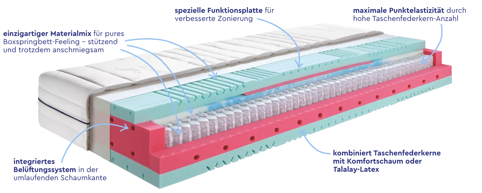 Für ein Höchstmaß an Komfort hat WERKMEISTER das Prinzip Taschenfederkern perfektioniert. Durch die aufwendige Kombination mit den herausragenden Qualitäten von Komfort-Kaltschaum oder Talalay-Latex entstehen in der WERKMEISTER Manufaktur Taschenfederkern-Matratzen von einzigartiger Qualität. Dank spezieller Funktionsplatten wird die 7-Zonen-Zonierung des Taschenfederkerns verstärkt und sorgt so für ein pures Boxspringbetten-Schlafgefühl. Das Ergebnis: perfekter Komfort!